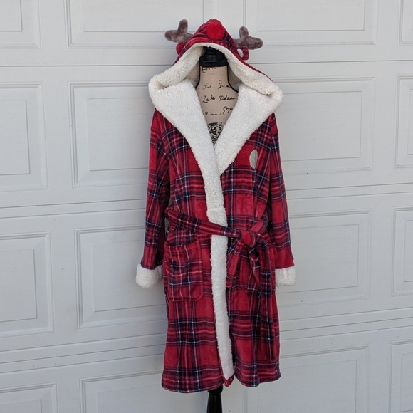Rudolph antlers ears and nose on the top of the hood. Peaches and Dreams Reindeer Hood red plaid soft fleece robe. Size medium Ultra soft and warm Reindeer Robe Size medium Pockets and hoodie UEC.